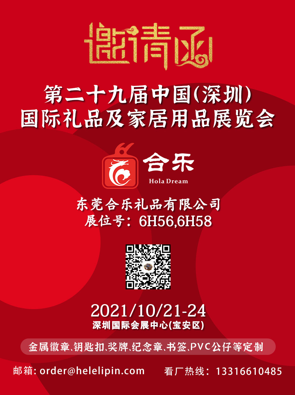 合樂禮品向各位新老客戶發(fā)出誠摯的邀請,期待與您相約在金秋十月的鵬城。合樂禮品依托集團(tuán)發(fā)展,37年專業(yè)設(shè)計(jì)定制生產(chǎn)琺瑯徽章、紀(jì)念章、金屬勛章、獎牌、鑰匙扣、PVC軟質(zhì)公仔盲盒等工藝禮品。我們已經(jīng)準(zhǔn)備好相關(guān)產(chǎn)品,并將竭誠為您解答各類產(chǎn)品專業(yè)技術(shù)問題和疑惑。您可以看到我們的新產(chǎn)品與服務(wù)領(lǐng)域,了解到我們的工廠規(guī)模與實(shí)力,感受到我們的服務(wù)熱情。